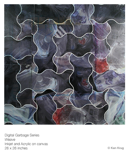 The Digital Garbage Paintings are created from photographs of garbage on the streets of New York City. Using a variety of software I manipulate, distort, and combine the images to create unique digital paintings. The resulting images are then to transfered to canvas, layered and further manipulated.